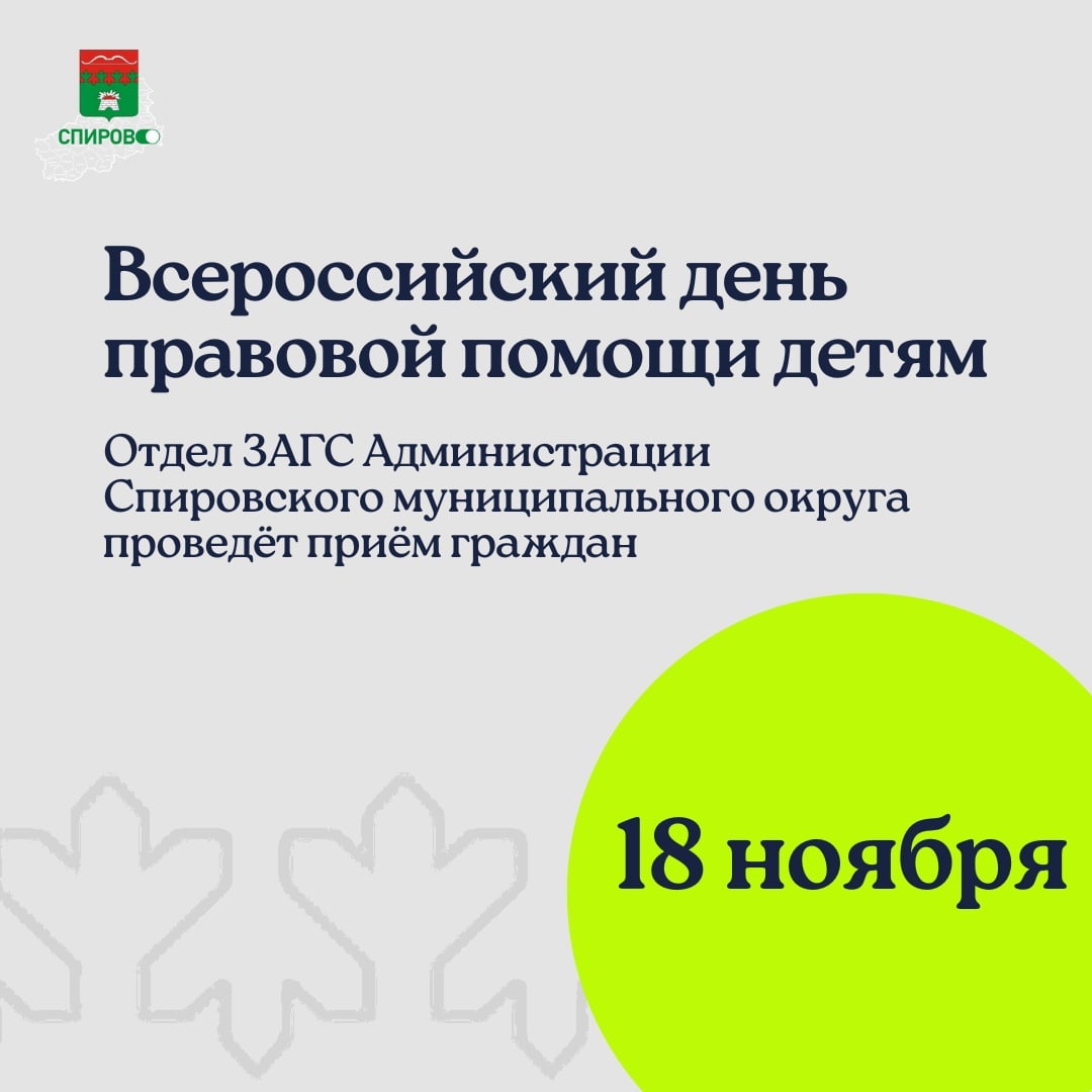 Отдел записи актов гражданского состояния Администрации Спировского муниципального округа проведет прием граждан в рамках Всероссийского дня правовой помощи детям.